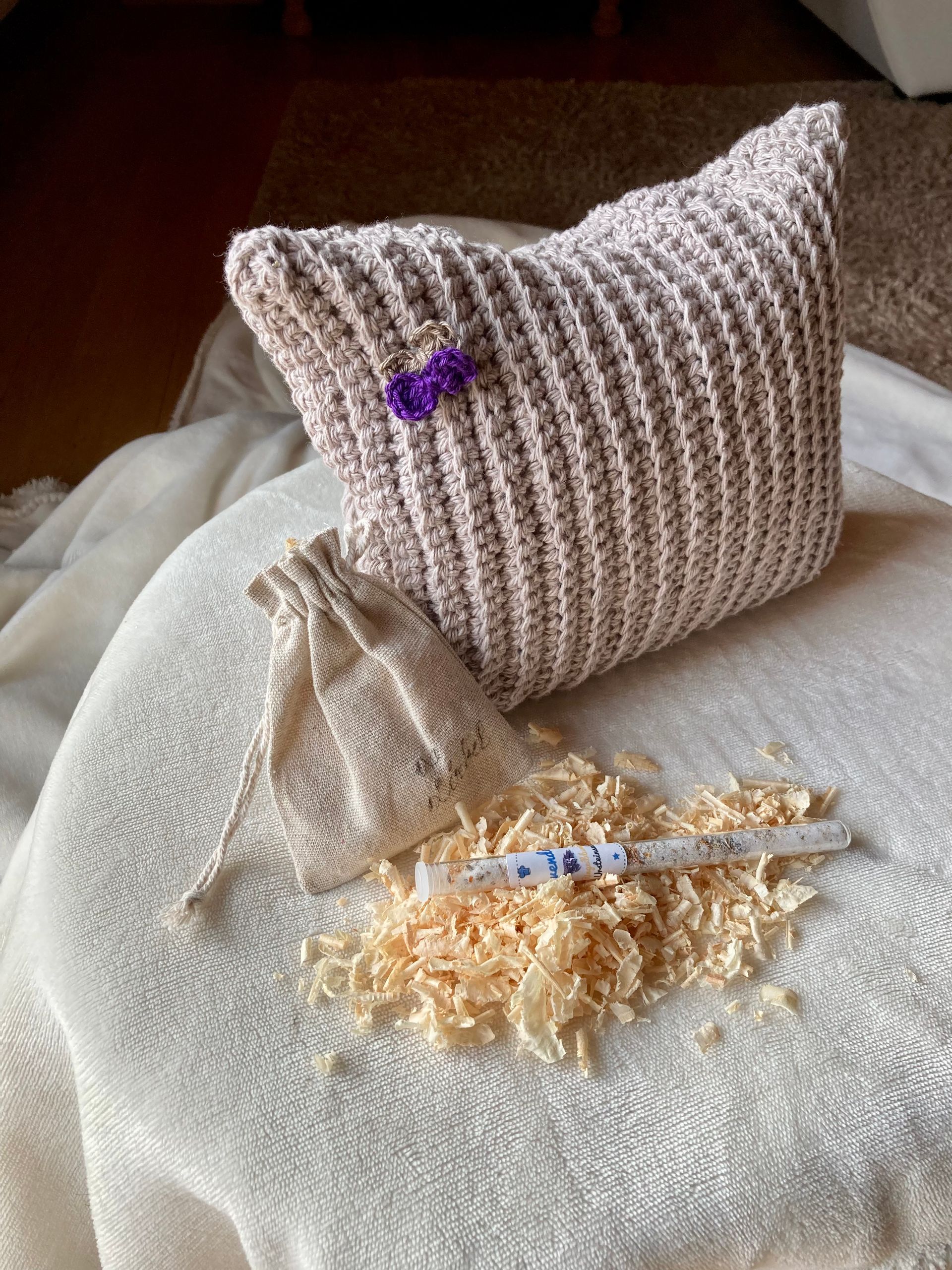 Zirbenspäne aus Tirol, einfach zum Wechseln, mit Leineninlet, gehäkeltes Kissen mit Hotelverschluss, waschbar, 100% gecycelte Baumwolle