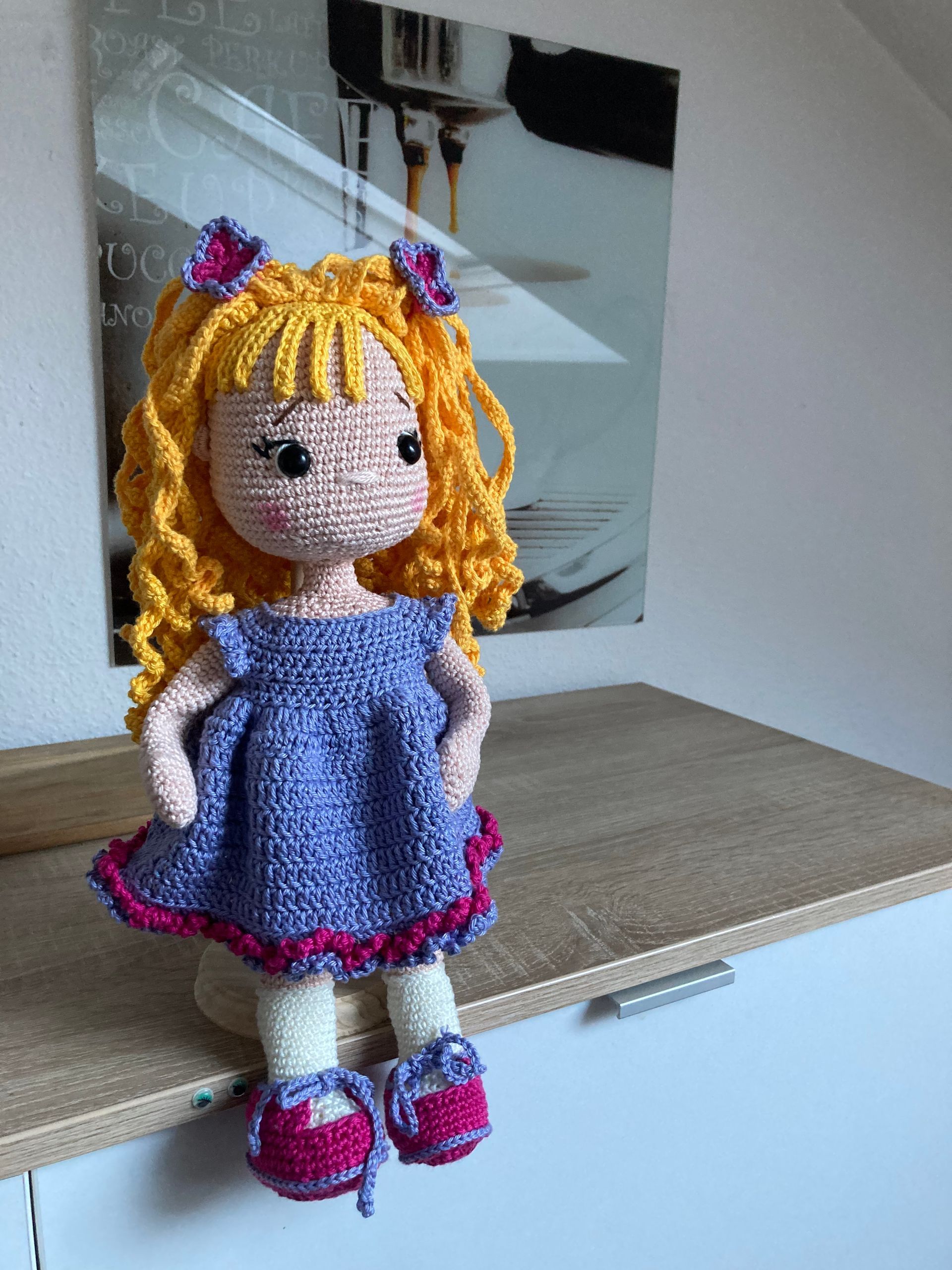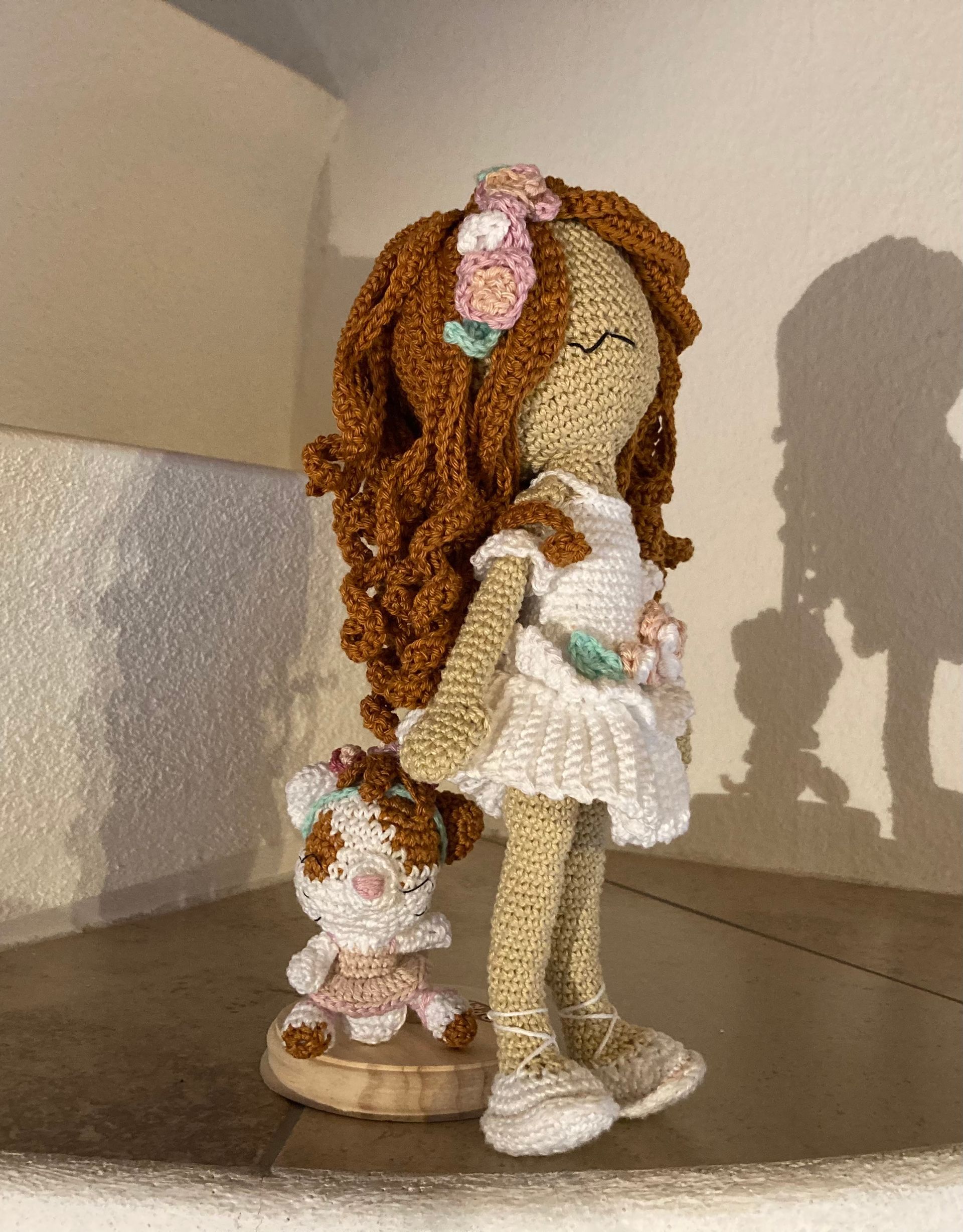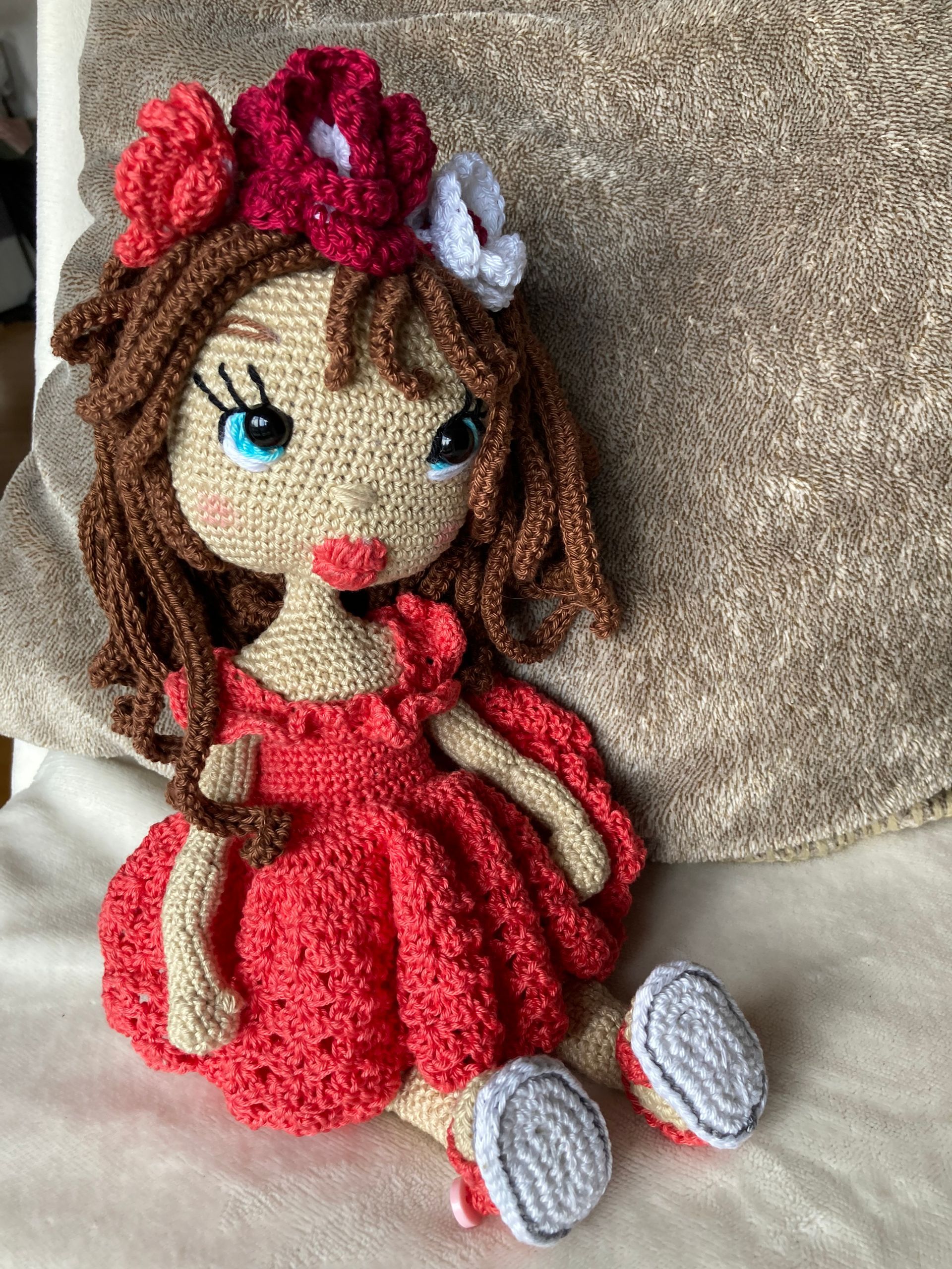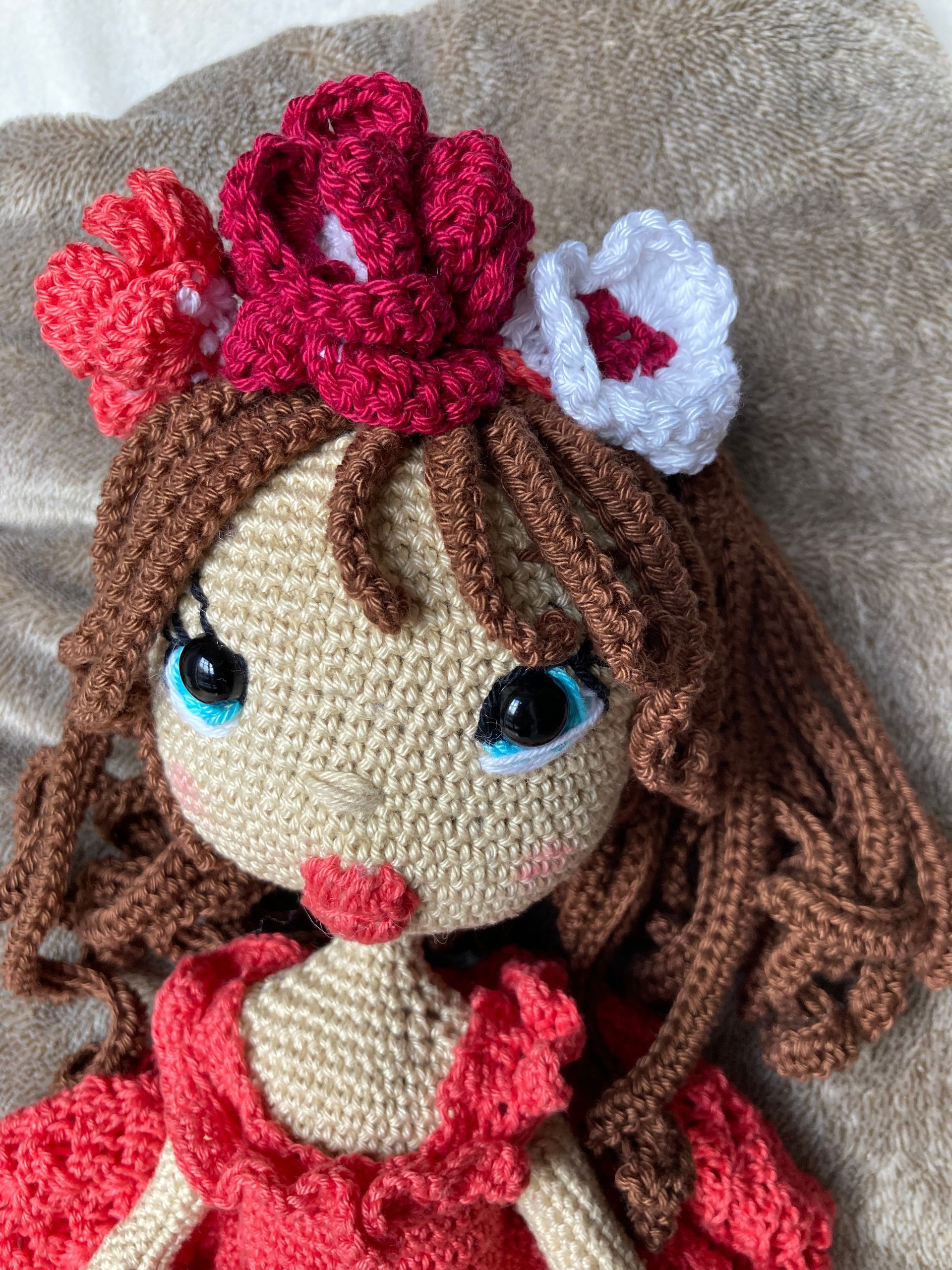 Pueppchen mit vollem Haar und Haarbändchen mit Blumen, Latinokleid in Koralle mit Unterhöschen und Sandalen, ausdrucksvolle Augen