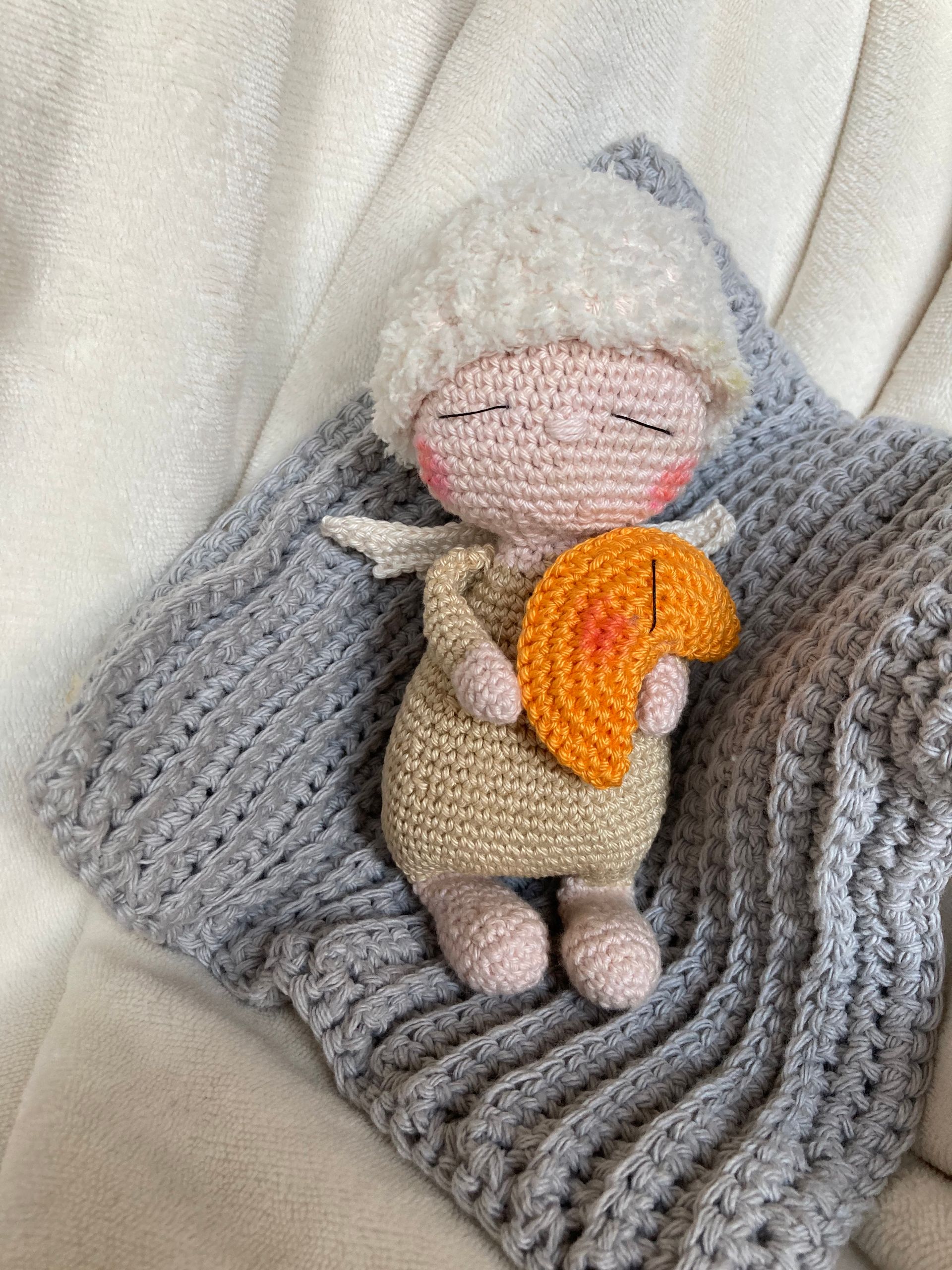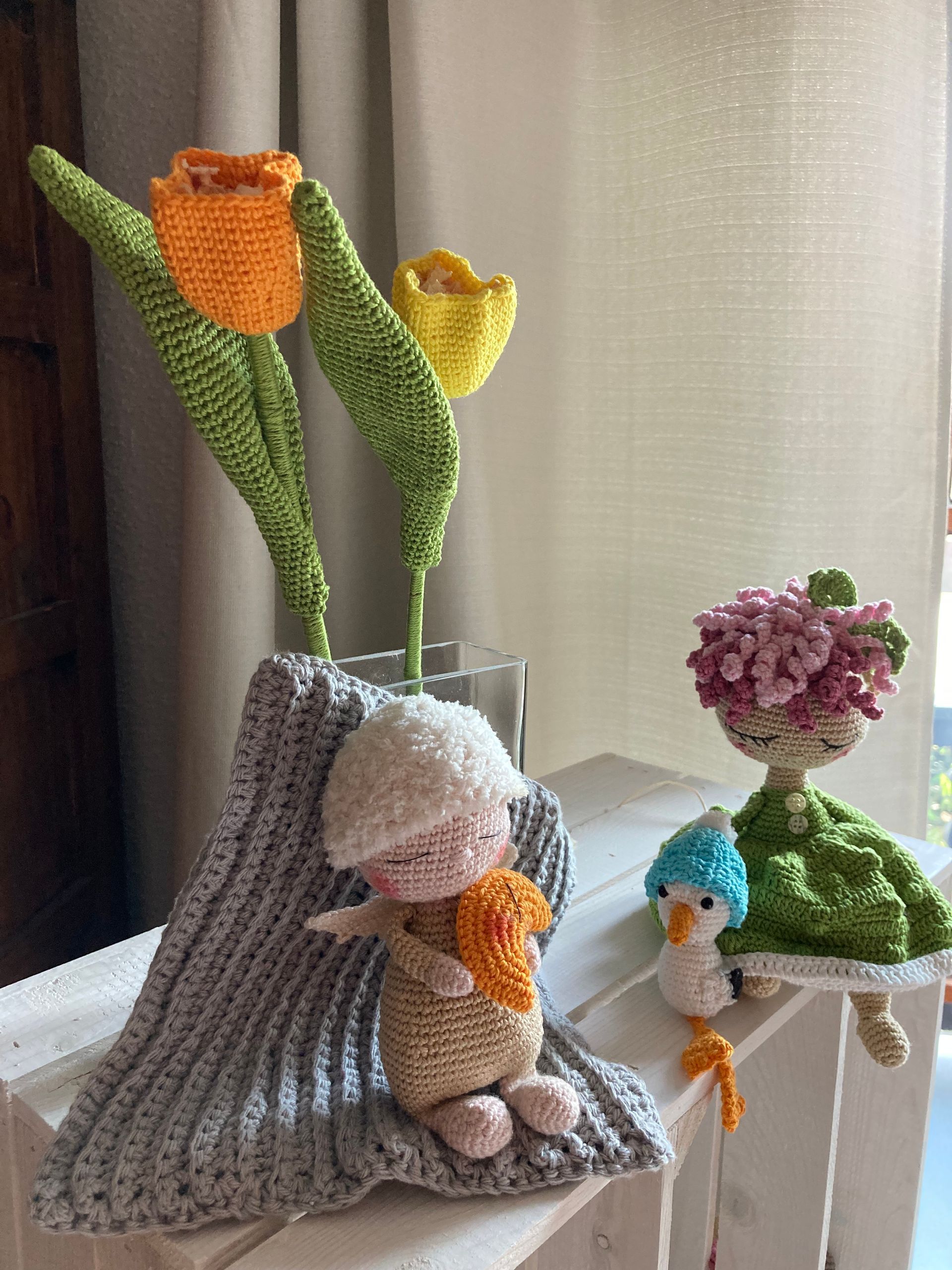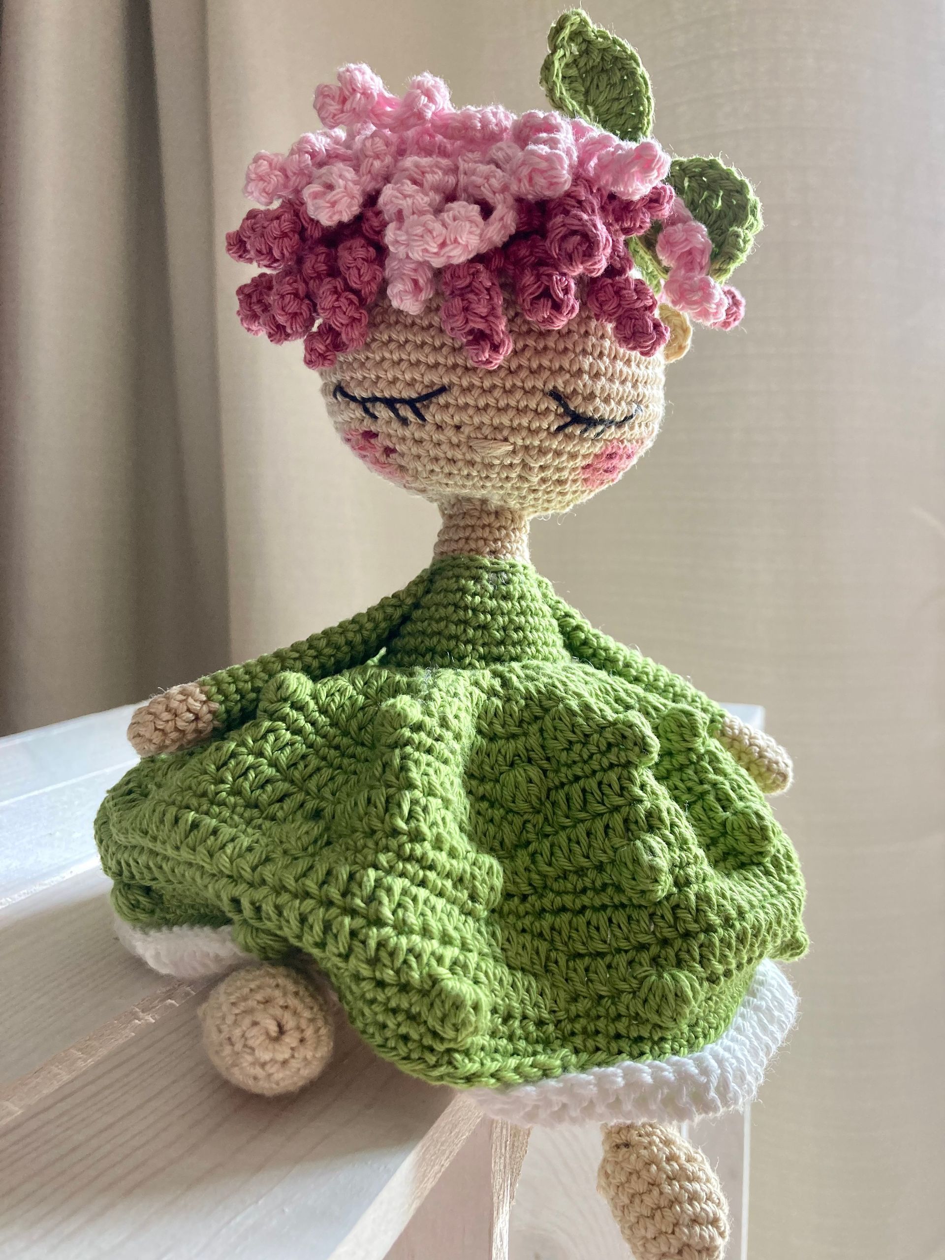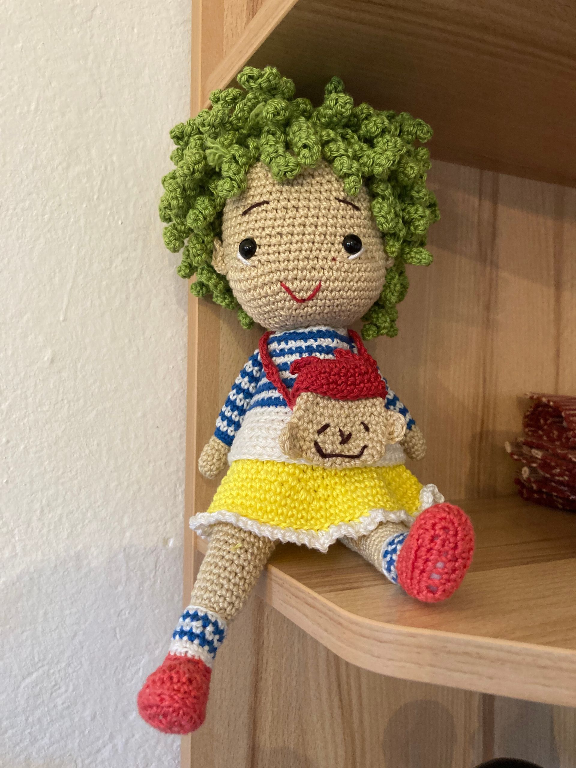 Pueppchen mit vollem Haar und Haarbändchen mit Blumen, Latinokleid in Koralle mit Unterhöschen und Sandalen, ausdrucksvolle Augen